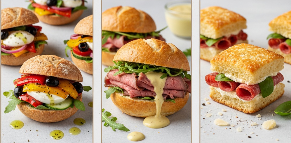 Mini sanduíche de ciabata com peito de peru, queijo branco e tomilho assado regados com pesto de manjericão pão australiano, rosbife caseiro, homus, rúcula, azeite, cebola e alface Americana